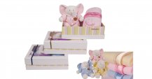 1. Gofrowany kocyk, obszyty tasiemką, haft - miś. Wymiary 110cmx75cm. 2. Maskotka słonik. Wysokość 20,5cm. >>