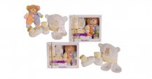 1. Bawełniany misio kocyk ozdobiony listkiem. Wymiary: 25cm x 25cm 2. Bawełniana misio grzechotka. 3. Bawełniany misio... >>